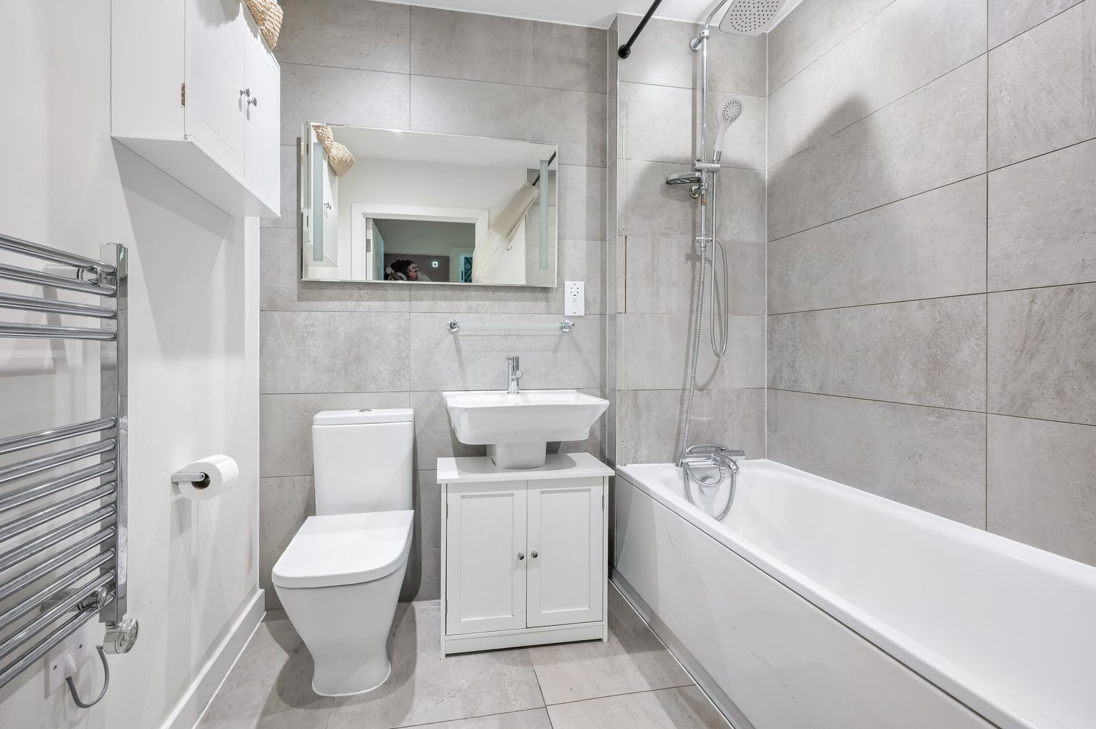 A family bathroom featuring a modern white bathroom suite with chrome fittings, comprising of a panel enclosed bath with mixer tap and both overhead rose and wall mounted shower fittings, low flush WC, pedestal wash basin, part tiled walls and tiled flooring, chrome wall mounted heated towel rail, a stylish illuminated mirror and inset spotlights.