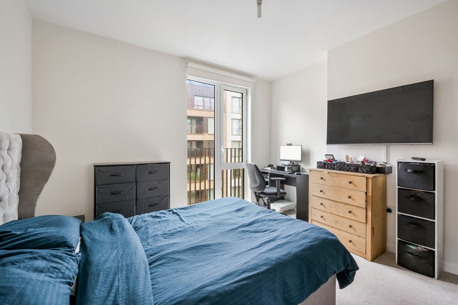 A good sized double bedroom featuring a fitted carpet, double glazed floor to ceiling casement windows to a Juliette balcony overlooking the front of the building, underfloor heating, pendant light fitting and TV, Telephone and media point.