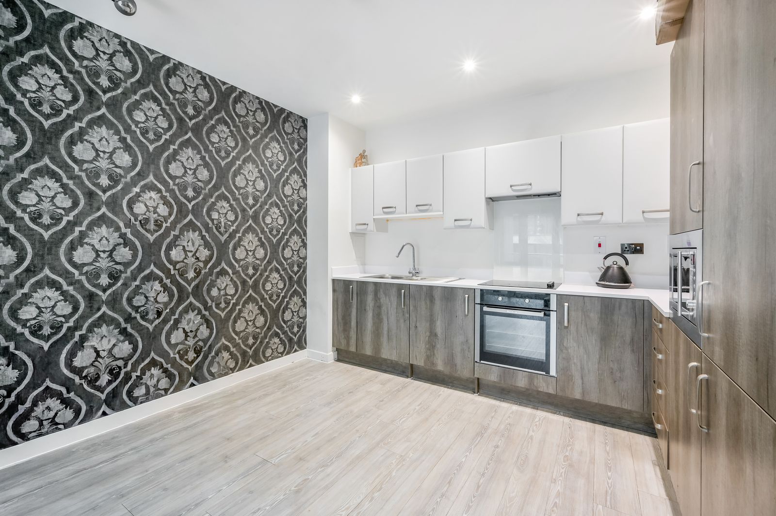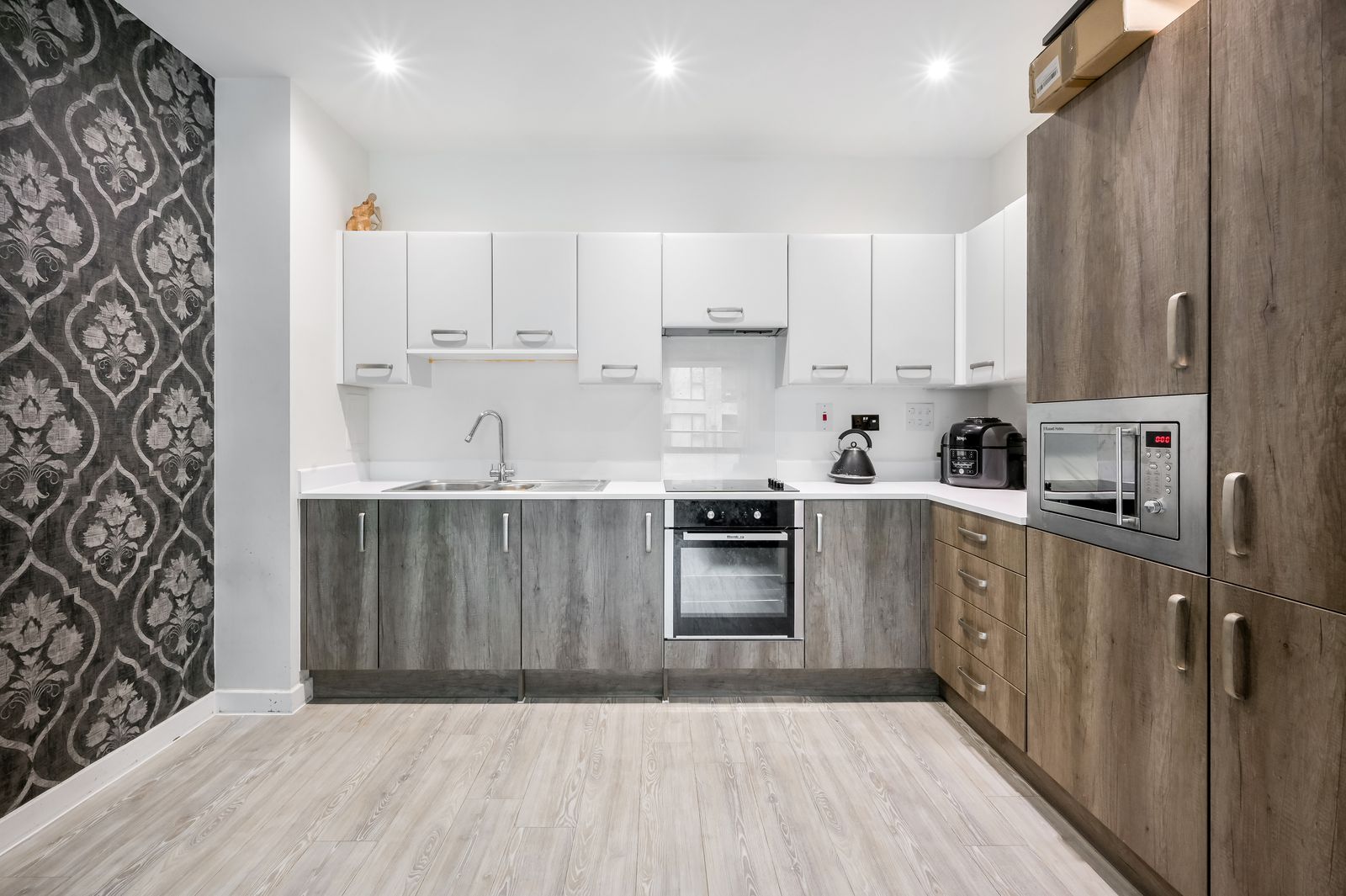 fan canopy above, integrated fridge/freezer and microwave, Amtico style wood effect flooring, underfloor heating and inset spotlights.