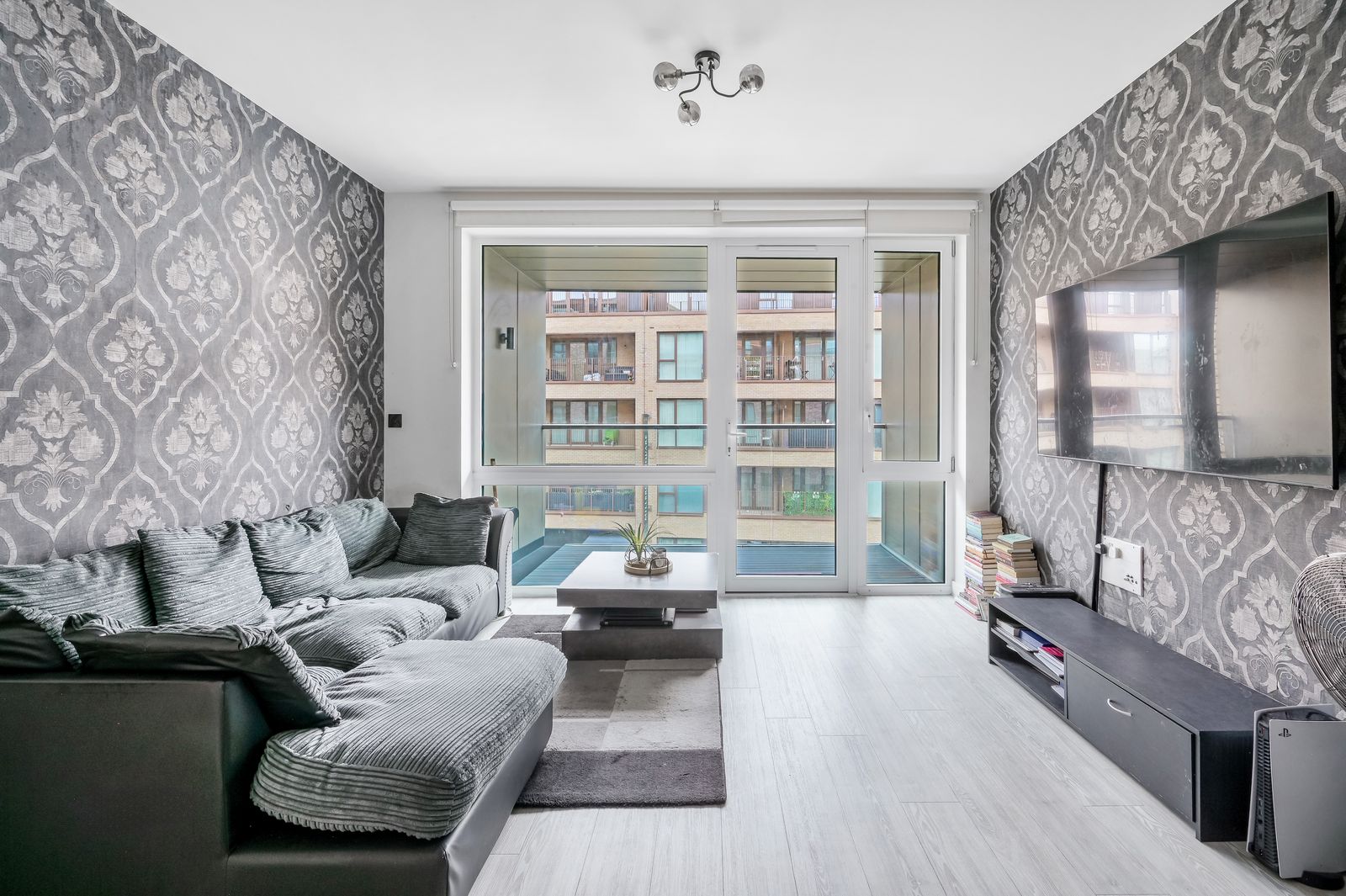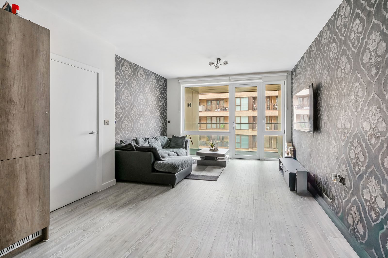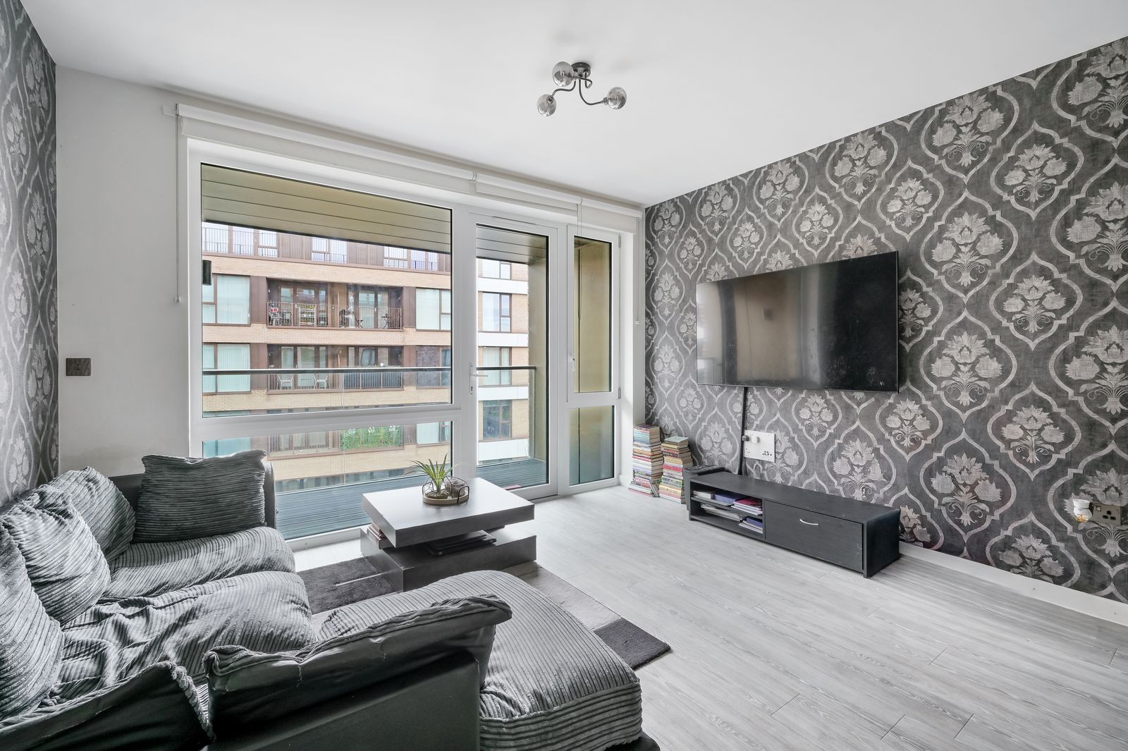 A bright reception room featuring Amtico style wood effect flooring, double glazed floor to ceiling casement windows and door giving access to the property’s private south-easterly facing balcony to the front of the building, feature light fittings, underfloor heating, TV, telephone and media points.